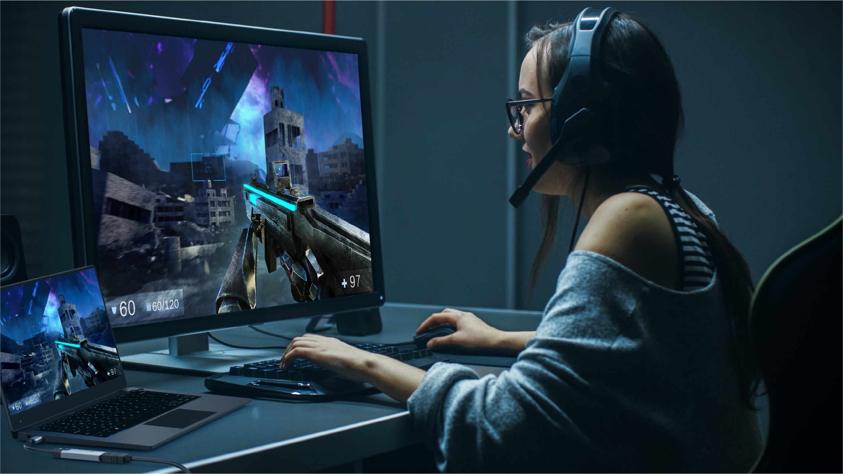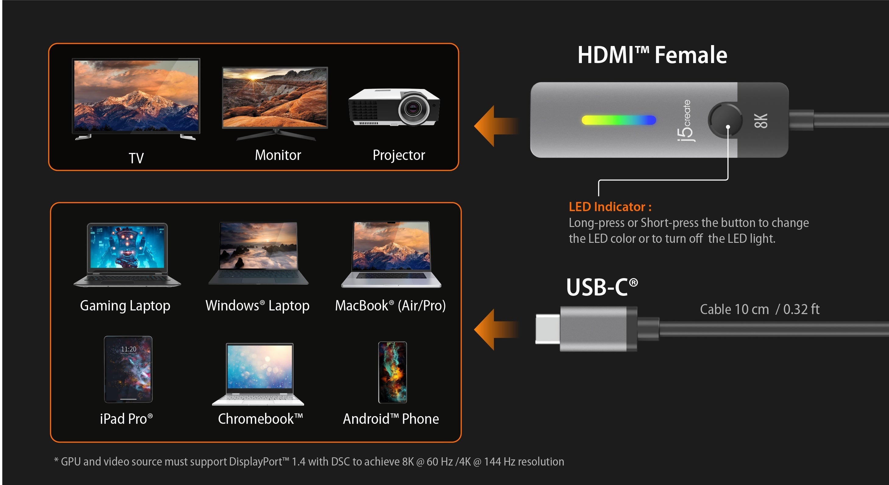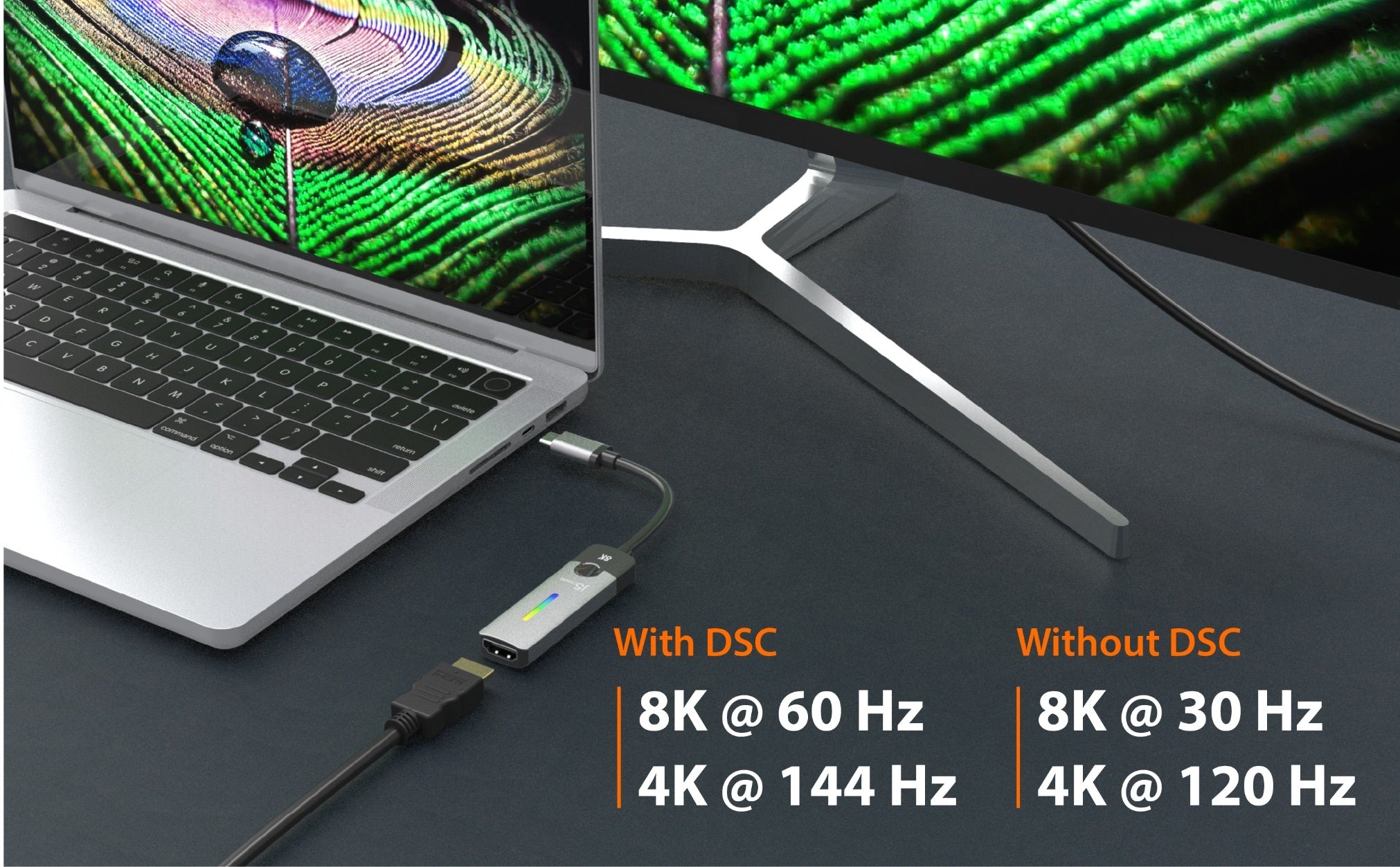 Our USB-C® to HDMI™ 2.1 8K Adapter allows you to conveniently connect your gaming laptop, MacBook®, Chromebook™, or tablet to an 8K UHD / 4K 144Hz external monitor, 8K UHDTV, projector and other display device using an HDMI™ input.