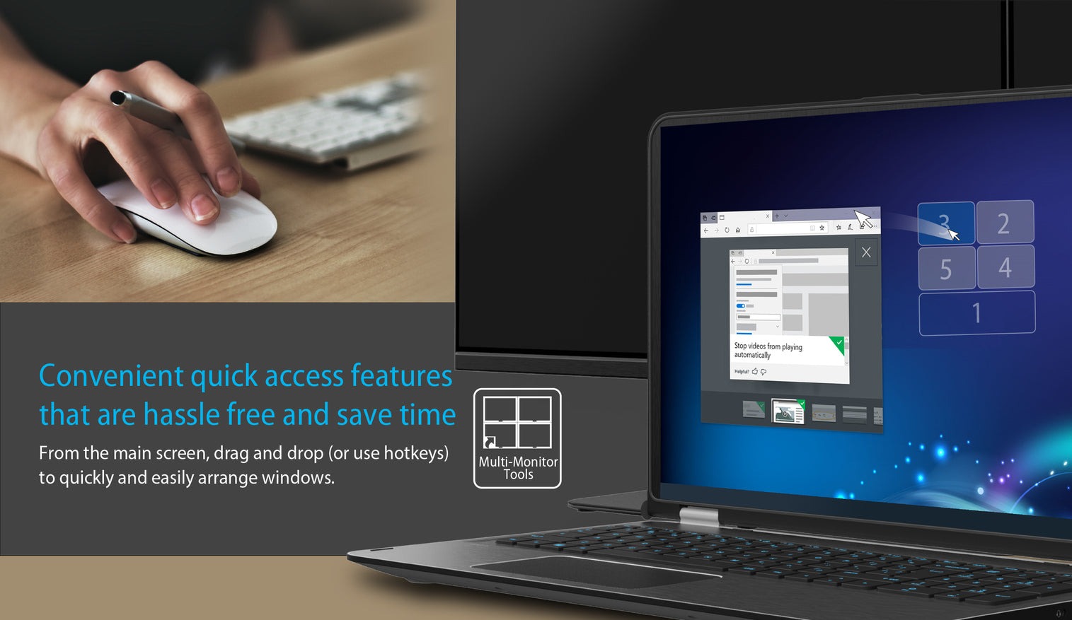 БЕЗКОШТОВНА ПРОГРАМА — ШВИДКЕ ПРИЗНАЧЕННЯ КІЛЬКОХ ВІКОН: Програма Multi-Monitor Assistant допомагає перетягувати, збільшувати та зменшувати, циклічно відображати курсор, каскадувати вікна на основному дисплеї та циклічно розширювати вікна на декількох моніторах за допомогою простих рухів (наразі доступно тільки для Windows®).
