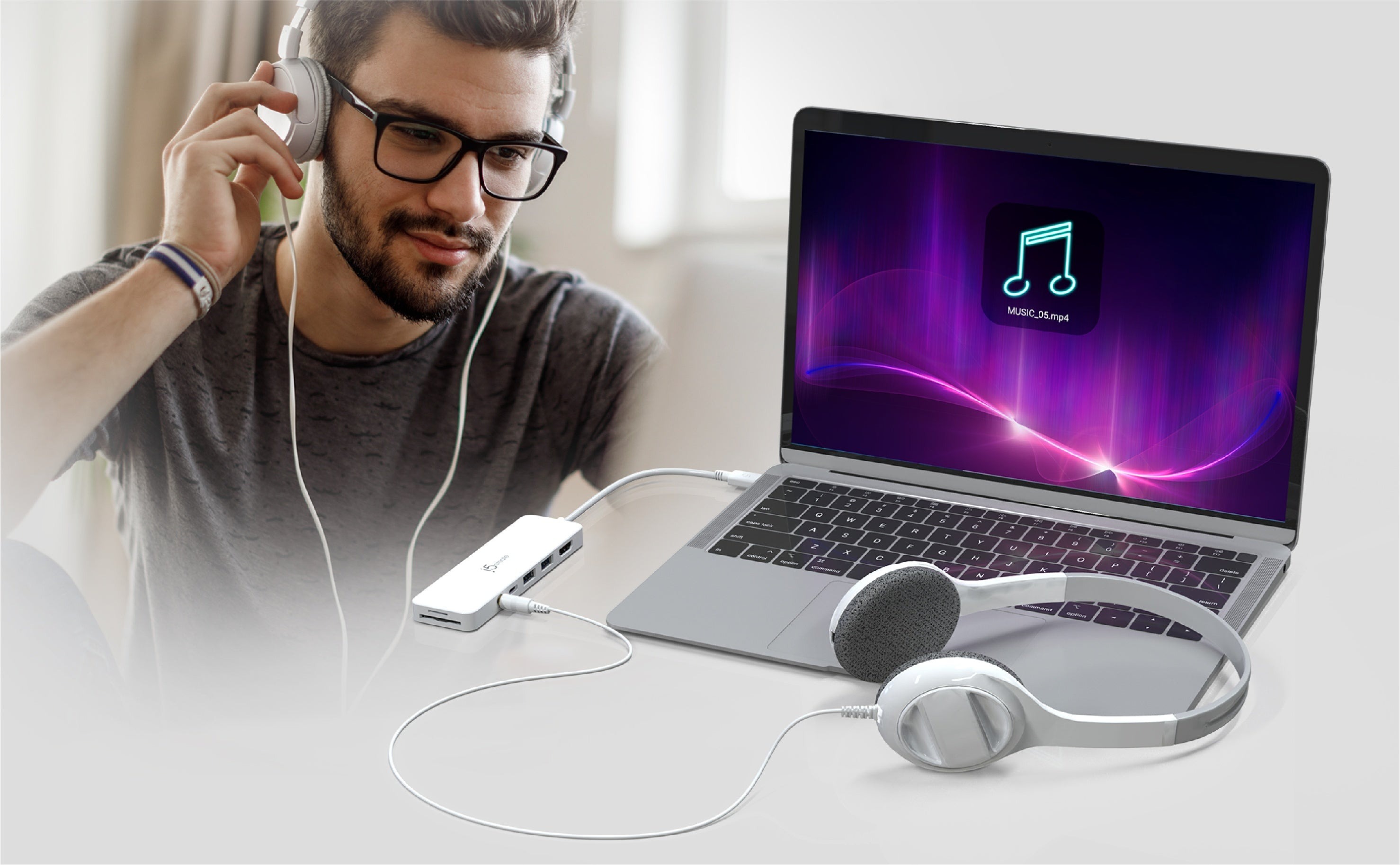 Оснащений портом зарядки USB-C® Power Delivery 3.0. Забезпечує зарядку потужністю до 60 Вт при підключенні до адаптера живлення USB-C®. Хаб також забезпечує прямий доступ до карт пам'яті SD™ і microSD™. Комбінований аудіо роз'єм дозволяє підключити навушники або колонки.