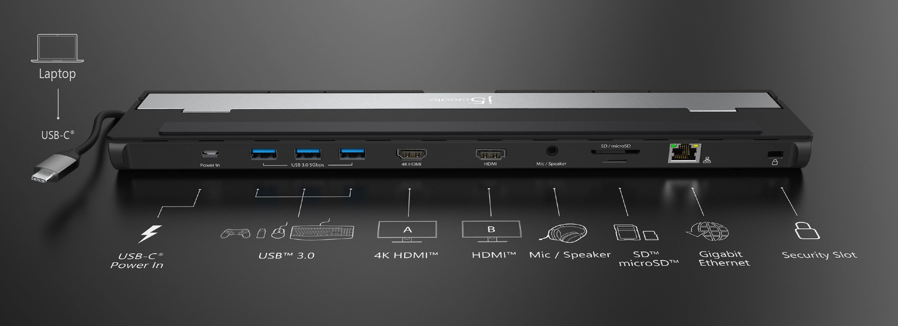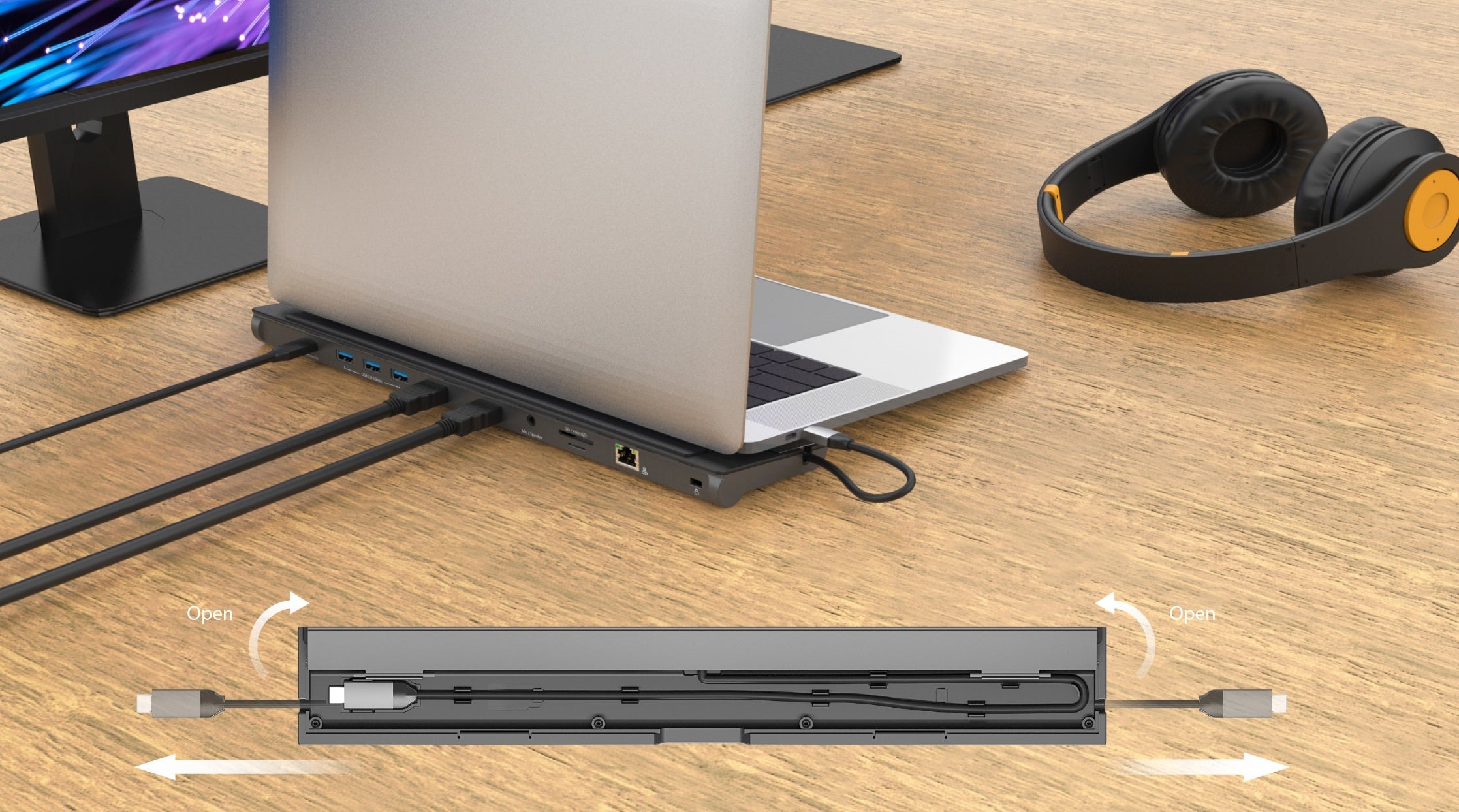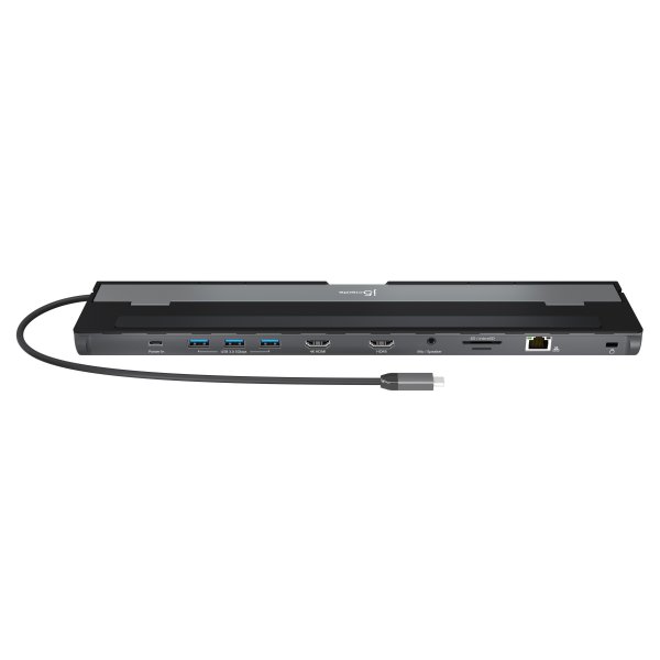 Ця док-станція USB™ 3.0 оснащена всіма необхідними роз'ємами, включаючи три порти USB™ 3.0, порт RJ45 Gigabit Ethernet, зчитувач/записувач карт пам'яті, комбінований аудіороз'єм і порт USB-C®, що підтримує живлення потужністю до 100 Вт. Вона також має слот для замка безпеки для захисту від крадіжки, що робить її ідеальною для використання в бізнес-організаціях. Завдяки тонкому дизайну, що розсіює тепло, та двосторонньому відсіку для зберігання кабелю, ця док-станція USB-C® забезпечує легке підключення незалежно від розташування порту USB-C® і легко вписується в будь-яке робоче середовище.