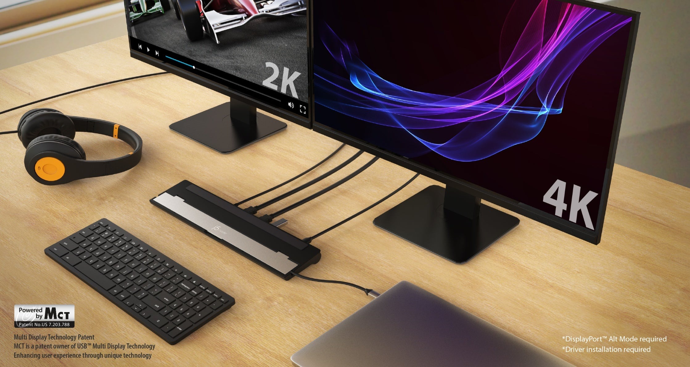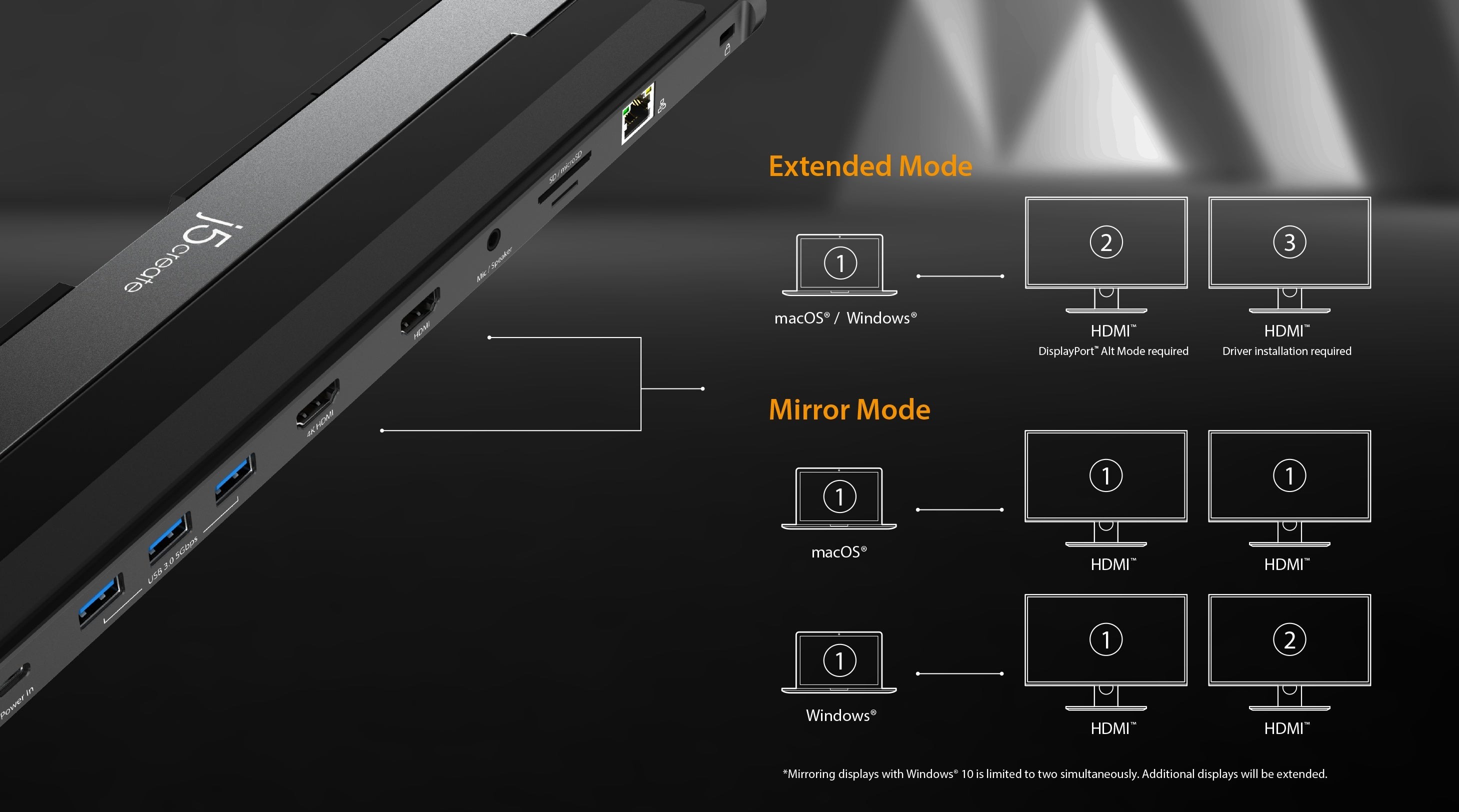 Ця док-станція надає можливість доєднати два монітори HDMI™ з підтримкою роздільної здатності до 4K (3840 x 2160) на одному дисплеї та до 2K (2048 x 1152) або 1080p на іншому дисплеї. Ви також можете використовувати екран ноутбука як третій дисплей, що полегшує одночасний доступ до декількох програм.