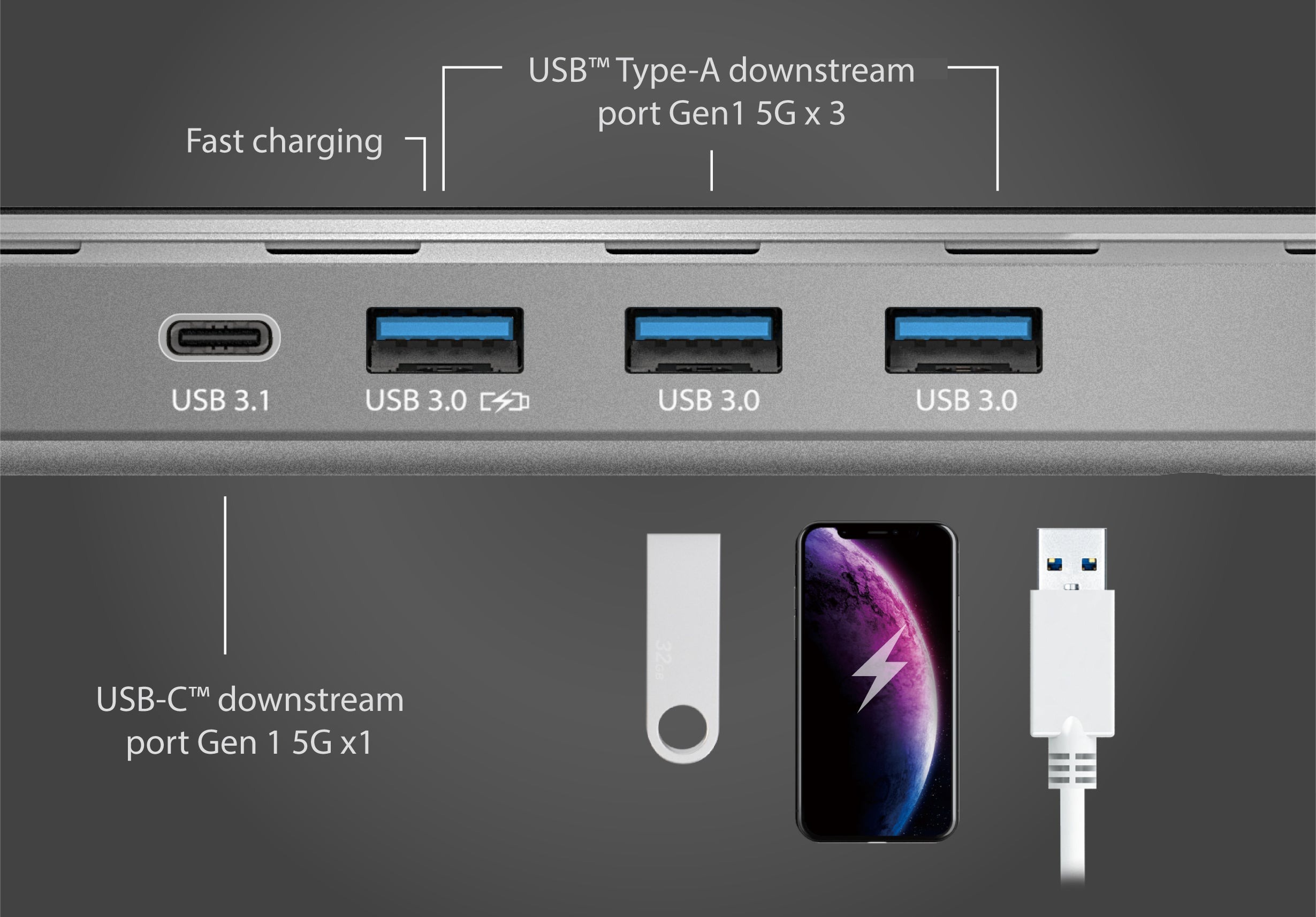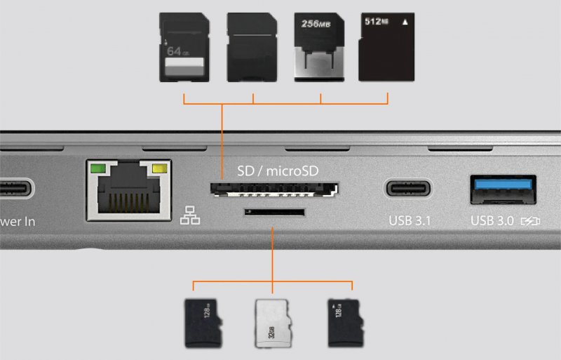 - Для підтримки всіх периферійних пристроїв USB™ док-станція має чотири порти USB™ 3.0 (1 порт USB-C™ і 3 порти USB™ Type-A), порт Gigabit Ethernet, слоти для карт SD™/microSD™ і комбінований аудіороз'єм.
