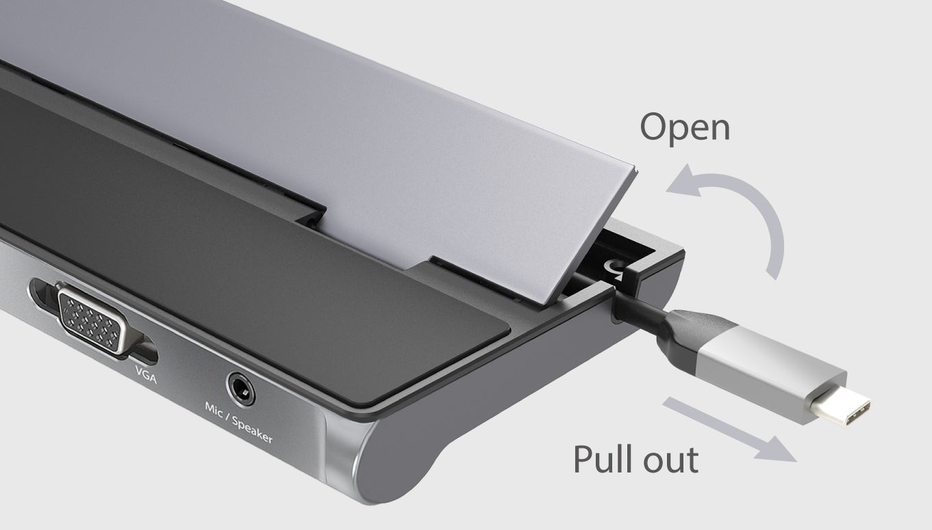 Ця док-станція USB™ 3.0 також оснащена портом RJ45 Gigabit Ethernet, пристроєм для зчитування/запису карт пам'яті та комбінованим аудіороз'ємом для максимальної продуктивності. Піднята конструкція сприяє відведенню тепла, а двосторонній відсік для зберігання кабелів забезпечує легке підключення незалежно від розташування порту USB-C™.