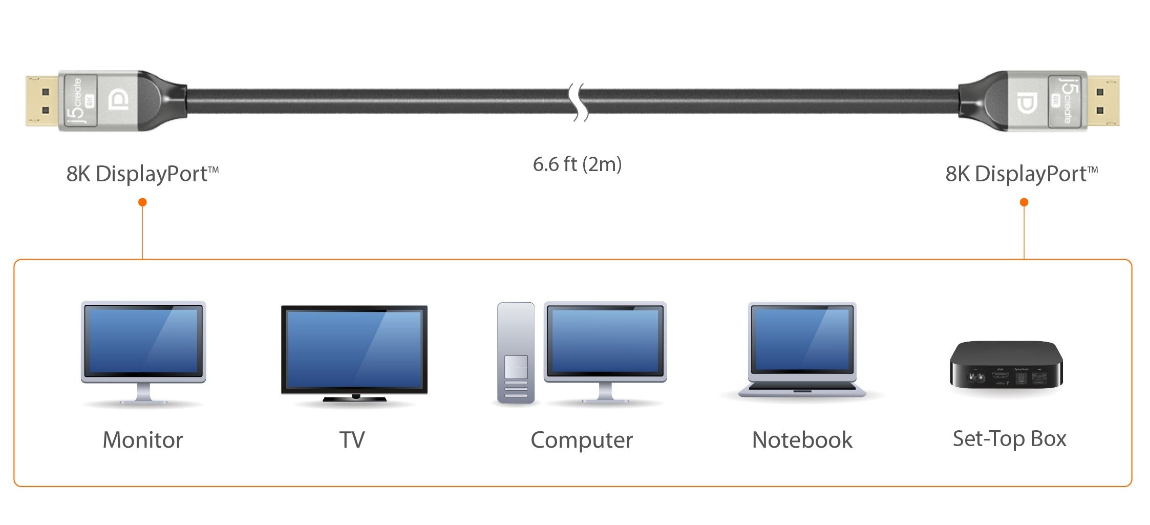 JDC43 — це кабель DisplayPort™ 8K, який передає як аудіо, так і відео. DisplayPort™ v1.4 підтримує 8K UHD (7680 × 4320) при 60 Гц з 30 бітами/піксель RGB і HDR або 4K UHD (4096 × 2160) при 120 Гц. Він також підтримує 3D. Теоретична пропускна здатність становить до 32,4 Гбіт/с. JDC43 має луджений мідний провідник і алюмінієве + плетене екранування, що забезпечує стабільне зображення без спотворень. Позолочені роз'єми забезпечують безперебійне з'єднання та надійну передачу. Роз'єми з замками забезпечують більш надійне з'єднання кабелю 8K DisplayPort™. Кабель JDC43 8K DisplayPort™ дозволяє підключити DisplayPort™ від ноутбука, настільного комп'ютера або телеприставки до монітора з високою роздільною здатністю, HDTV або проектора з входом DisplayPort™.