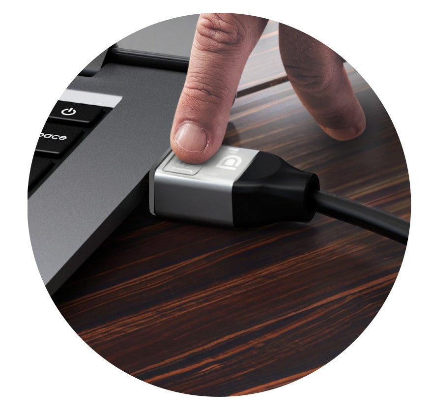 Конструкція роз'єму з фіксатором запобігає випадковому від'єднанню та не дозволяє йому розхитуватися або випадати з пристроїв. Для забезпечення цілісності ноутбука або пристрою для потокового передавання даних обережно натисніть на фіксатор, а потім від'єднайте кабель.