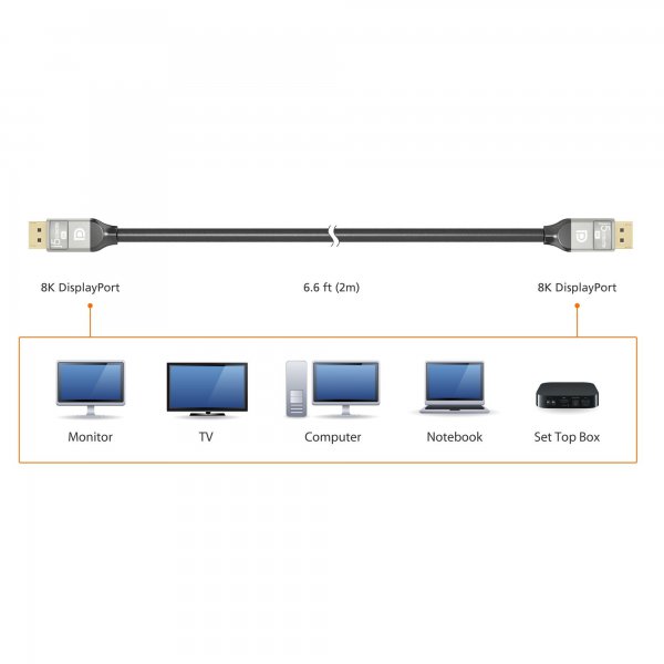 Кабель 8K DisplayPort™ забезпечує вищу продуктивність для високих роздільних здатностей до 4K x 2K. Підтримує роздільну здатність до 7680 x 4320 / 4096 x 2160p / 1080p 3D. Підтримує швидкість передачі даних/пропускну здатність до 32,4 Гбіт/с. Ідеально підходить для ігор або перегляду фільмів на телевізорі або моніторі.