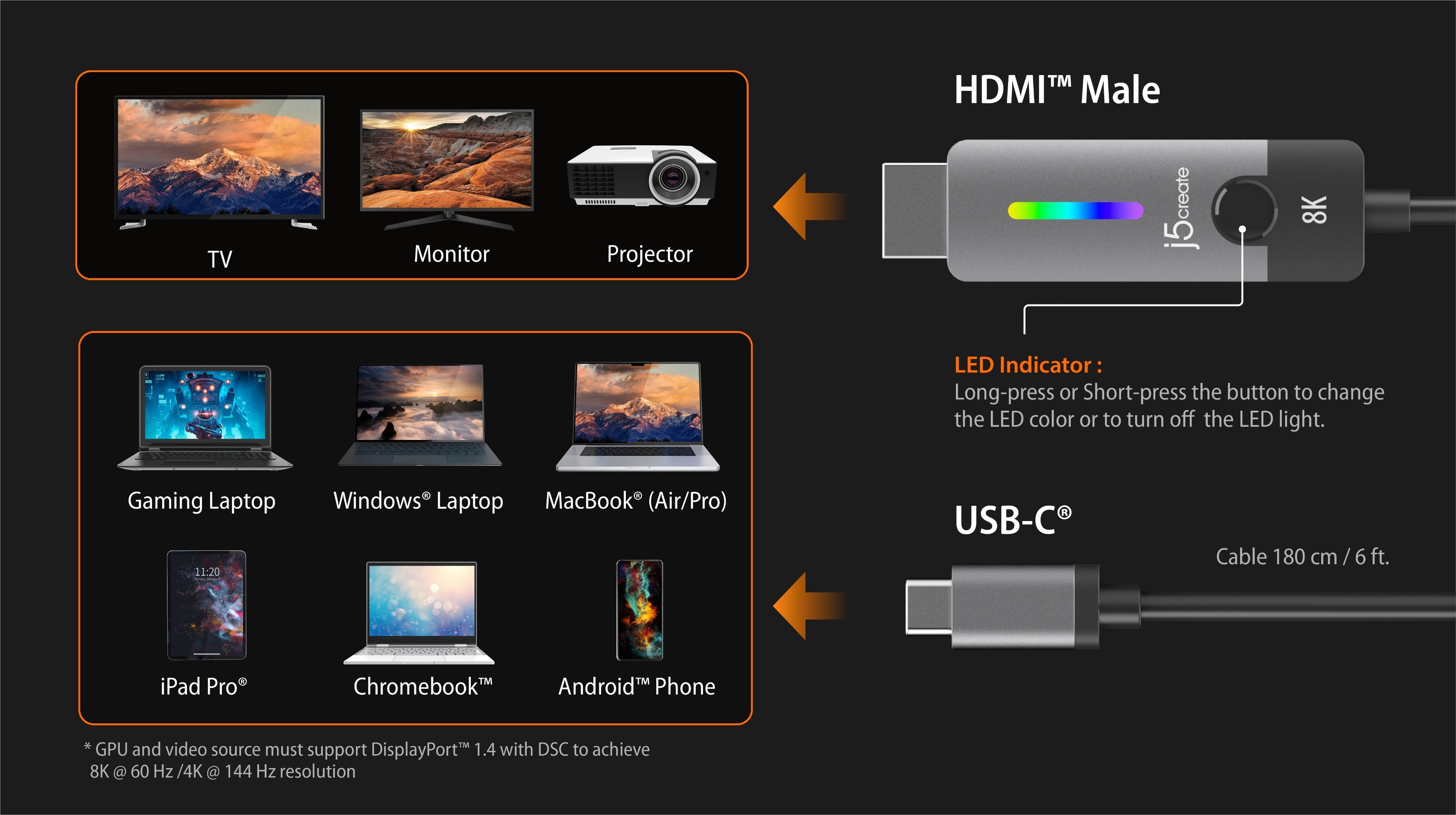 Наш кабель USB-C® до HDMI™ 2.1 8K дозволяє зручно підключити ігровий ноутбук, MacBook®, Chromebook™ або планшет до зовнішнього монітора 8K UHD / 4K 144Гц, 8K UHDTV, проектора та інших пристроїв відображення за допомогою входу HDMI™.