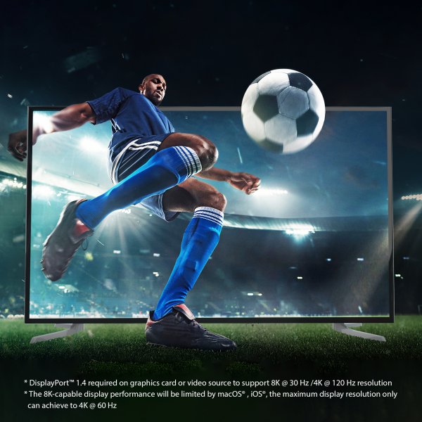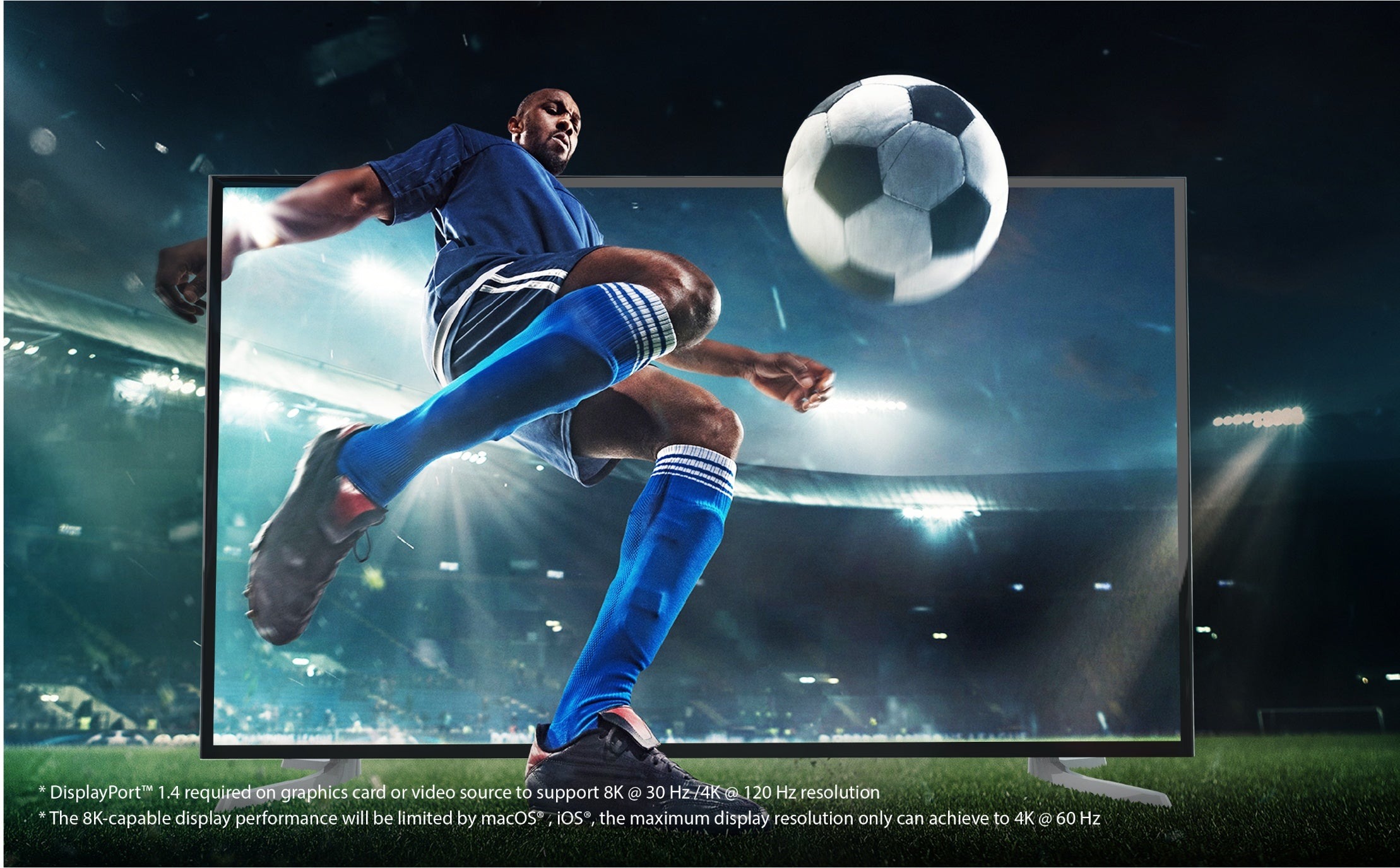 Графічний процесор і джерело відеосигналу повинні підтримувати DisplayPort™ 1.4 з DSC для досягнення роздільної здатності 8K при 60 Гц / 4K при 144 Гц.