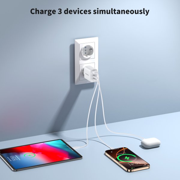 • Універсальний блок живлення з трьома USB-портами з загальною потужністю 30 Вт